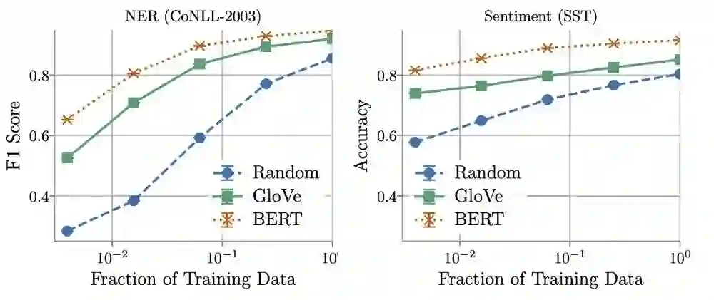 作者发现,与BERT相比,训练数据量在确定GloVe和随机嵌入的相对性能方面起着关键作用。使用更多的训练数据,非上下文嵌入可以快速改进,并且在使用所有可用数据时,通常能够在5% 10%的BERT范围内执行。。