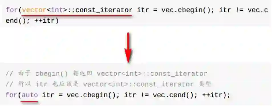 举个栗子。C++11之前如果我们要定义并初始化一个新变量,必须得知道其类型并定义,这在很多时候是非常繁琐的,比如迭代器的使用,而C++11之后引入了自动类型推导,一个auto解决一切,不需要关心类型,编译器会帮你自动推导出类型。