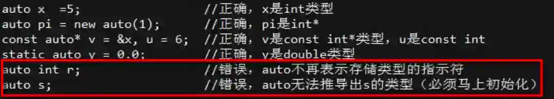 比如auto不能代表一个实际的类型声明,auto声明的变量必须马上初始化