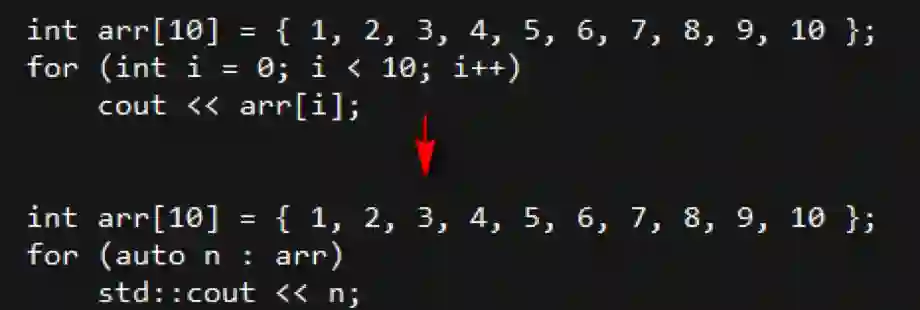 for循环是使用频率非常高的循环方式,在新特性里我们不需要再像以前那样每次都使用自增或者自减的方式来索引了,结合前面介绍的auto,我们可以极大简化循环方式,如下图所示: