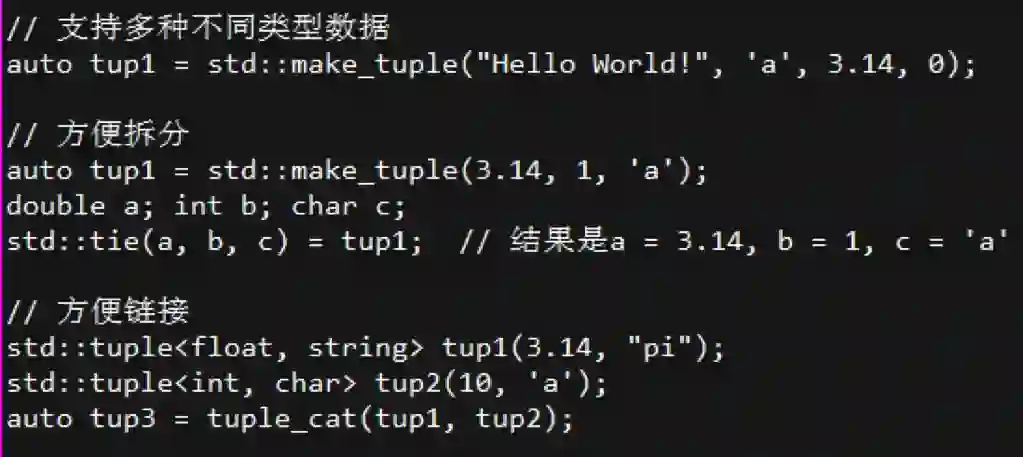 在Python和MATLAB中可以非常方便的使用可以变长的参数,C++11以后引入了tuple,可以实现类似功能,并且可以传入多个不同类型的数据,如下图所示
