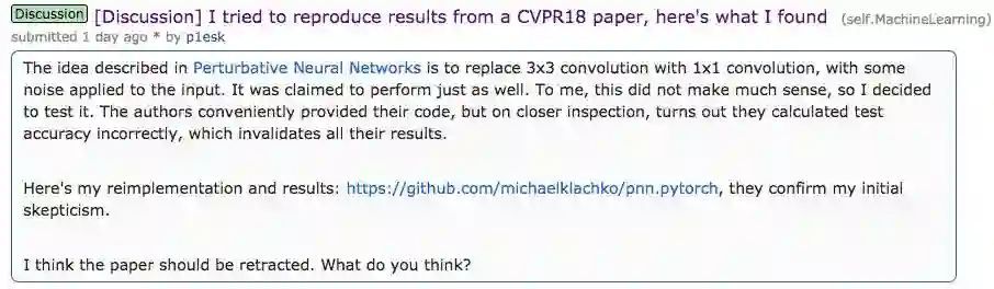 事情是这样的,有人试着去复现了CVPR 2018的一篇论文——CMU和密歇根州立大学的《Perturbative Neural Networks》,发现得不到作者在论文中所描述的结果,他认为这表明论文作者计算有误,因此其结果无效,于是就在Reddit发帖(在他大前天向作者发邮件但没有收到回复后)问众网友: