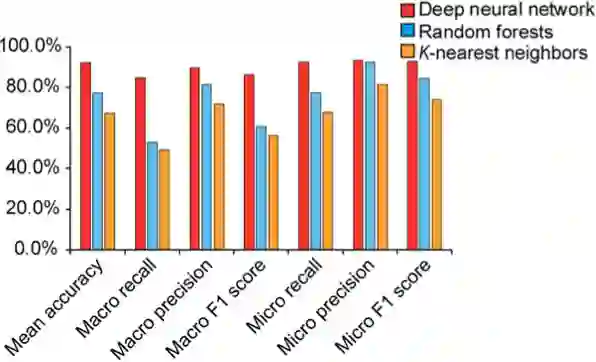 作者也同随机森林和K近邻算法进行比较,发现深度神经网络比其它两个模型更好,如下图。