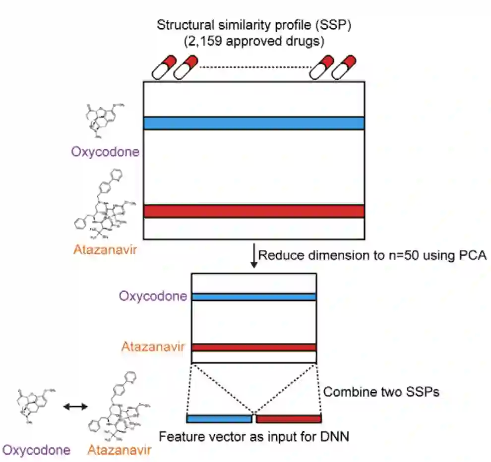 得到SSP,它是对药物表示的2159维特征向量。把两个输入药物的特征向量,都用PCA降到50维的向量,然后将两个药物的特征表示concat一起,得到100维的Feature vector作为DNN的输入。