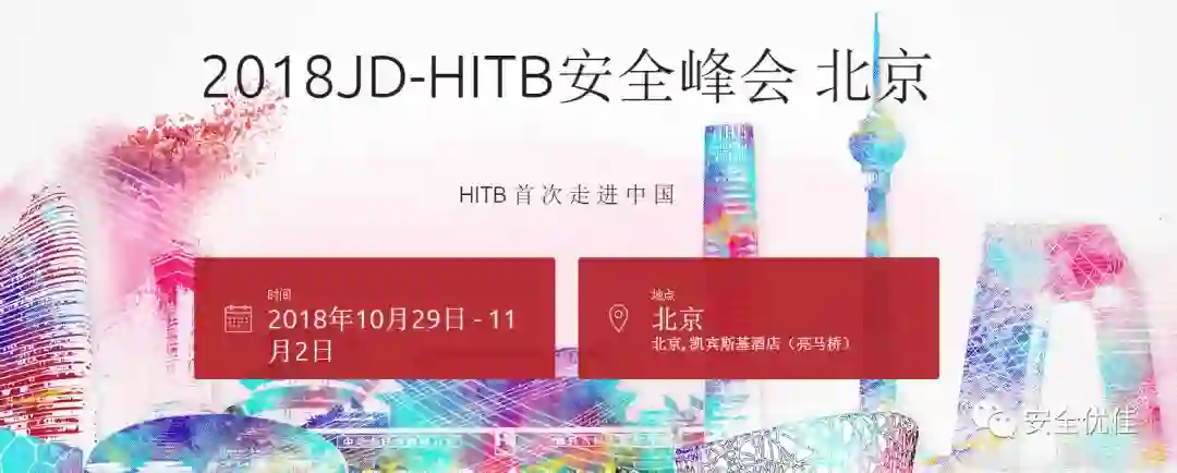 此次与京东安全联合举办的“2018 JD-HITB 安全峰会”将在北京凯宾斯基酒店举行,其中10月29、30和31日为培训日,10月31日为领袖峰会日,11月1日和2日为技术峰会日。CTF 竞赛将于11月1日和2日举行。在此期间,大赛还将设立免费向公众开放的 CommSec 展览和技术展示区。
