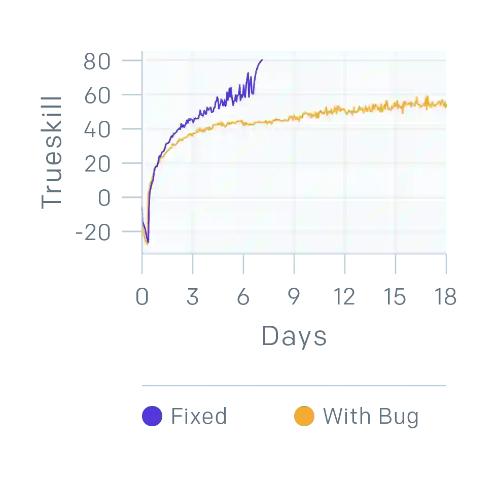 我们仍在修复错误。上图中的黄线模型已经可以击败业余玩家,但修复了一些Bug后,它的提升非常明显。这给我们带来的启示是即便已经击败更强的人类玩家,我们的模型还是可能隐藏着严重错误。