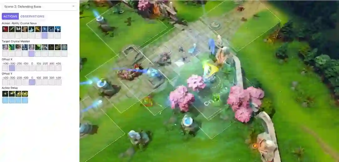 下图是OpenAI Five使用的观察空间和动作空间的交互式演示。它把整张地图看做一个有20,000个数据的列表,并通过8个列举值的列表来采取行动。这个场景是夜魇上天辉高地,我们选中冰女,可以发现,冰女脚下的9×9小方格表示她可以前进位置,其中白色目标方块的坐标是(-300,0)。大方框表示可以放Nova地方,目标分别是投石车、小兵、毒龙、巫妖、瘟疫法师和另一个冰女。