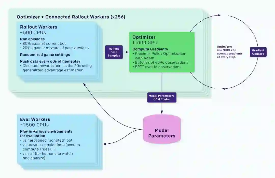 整个训练系统被分为rollout workers和optimizer两部分,其中前者运行一个游戏副本,并用一个智能体收集经验,后者则在一系列GPU中执行同步梯度下降。rollout workers通过Redis跟optimizer同步经验。如上图所示,每个实验还包括一个Eval workers的过程,它的作用是评估经过训练的智能体和参考智能体。除此之外还有一些监控软件,如TensorBoard、Sentry和Grafana。