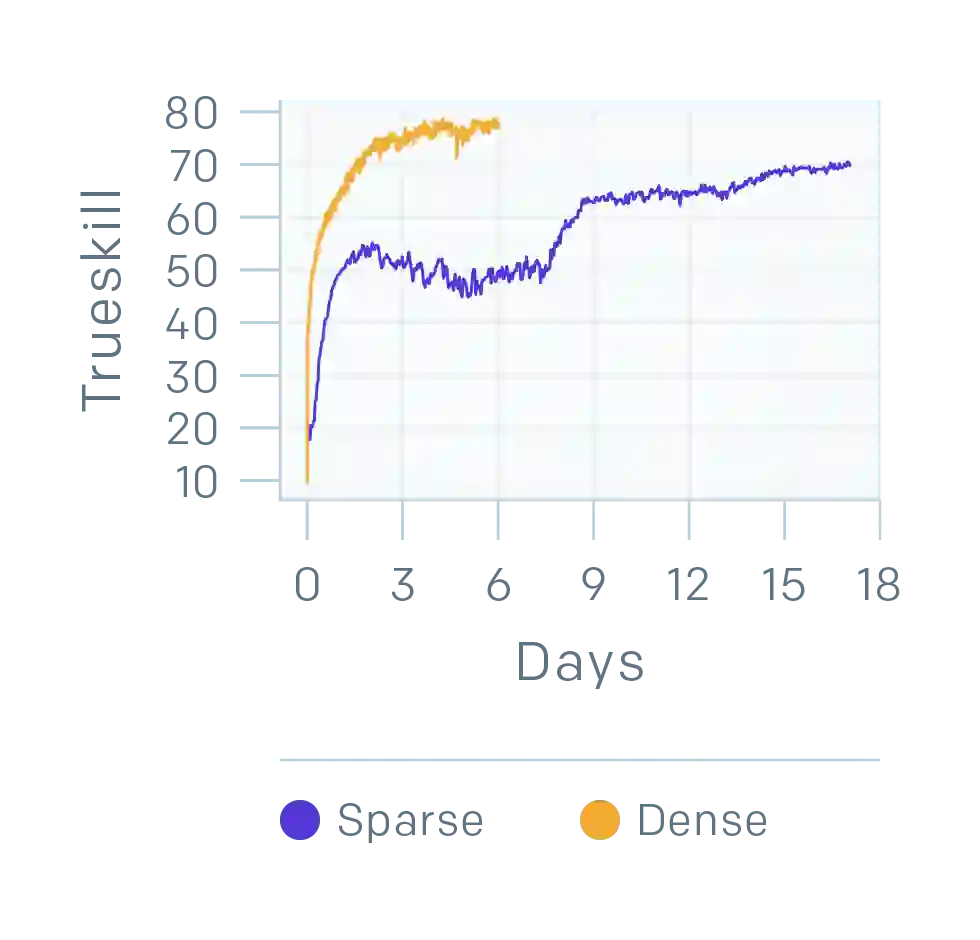 上述探索自然离不开回报的指引。我们为Dota2设计的回报机制基于人类玩家对行为的具体评判:团队作用、技能施放、死亡次数、助攻次数和击杀次数等。为了防止智能体钻漏洞,我们的方法是计算另一队的平均表现,然后用本队英雄表现减去这个值来具体评判。
