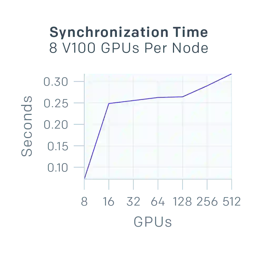 上图显示了不同数量的GPU同步58MB数据(OpenAI Five参数)的延迟,几乎可以被并行运行的GPU计算所掩盖。