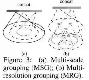 为了解决MSG计算量太大的问题,作者提出了MRG。此种方法在某一层对每个局部提取到的特征由两个向量串联构成,如下图(b)所示。第一部分由其前一层提取到的特征再次通过特征提取网络得到,第二部分则通过直接对这个局部对应的原始点云数据中的所有点进行特征提取得到。