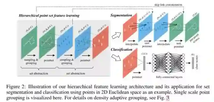 PointNet提取特征的方式是对所有点云数据提取了一个全局的特征,显然,这和目前流行的CNN逐层提取局部特征的方式不一样。受到CNN的启发,作者提出了PointNet++,它能够在不同尺度提取局部特征,通过多层网络结构得到深层特征。PointNet++由以下几个关键部分构成: