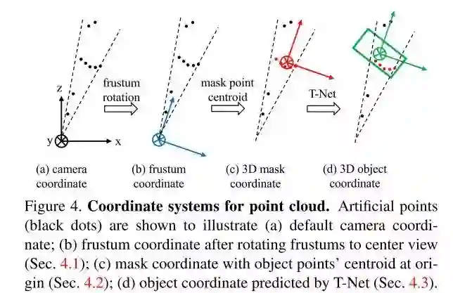 综上所述,F-PointNet是一个多步骤的3D目标检测算法。如下图所示,为了应对点云数据中各个目标的视角不变性和得到更准确的bbox回归(通过缩小需要回归的值的取值范围),算法需要进行三次坐标转换。模型的loss和2D的目标检测一样是包含分类以及回归的多任务loss。同时,作者提出了一种被称为corner loss的损失函数来对目标的中心、朝向和大小进行联合优化,避免由于某一方面的不准确而主导loss。