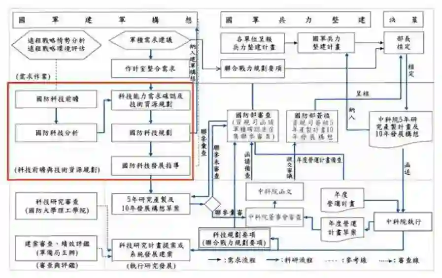 国防前瞻规划机制作业,乃采以国防科技发展趋势为方向、考虑军队远程战略情势、国际环境分析与军队各军种需求为输入,利用作战场景需求进行验证,在完整规划下,提出愿景、拟订10年建军构想、5年兵力整建。上述作为,于运用年度重要演训规划(如计算机辅导兵棋推演等),结合美方观察人员就台湾用兵作战现况从旁了解,以推估实际用兵作战情形,来审认并多方讨论与修正方向,藉由检讨会方式,提出可行性建议,确立10年建军构想、5年兵力整建规划蓝图后,旋由战略规划司启动建案程序,并请资源规划司与军备局移交由中山科学研究院开始投入预测的新武器需求后,进行技术地图展开及建案审查,以完成“国防”科技规划后,逐步进行10年发展构想及5年科技研究应用与产制计划(如图2)。23