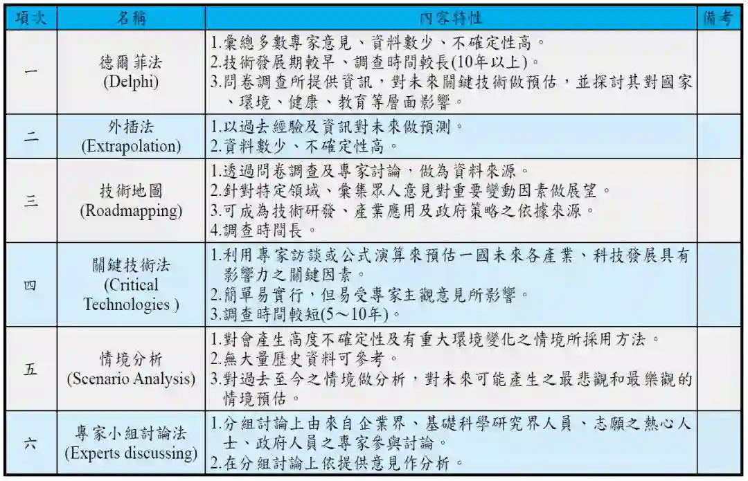 承上,因科技技术随着时间更迭不断推陈更新,新兴技术取代旧有、不符合潮流之技术,于预测未来科技发展趋势走向,常运用以下方法特性(如表1),来论述科技前瞻规划。