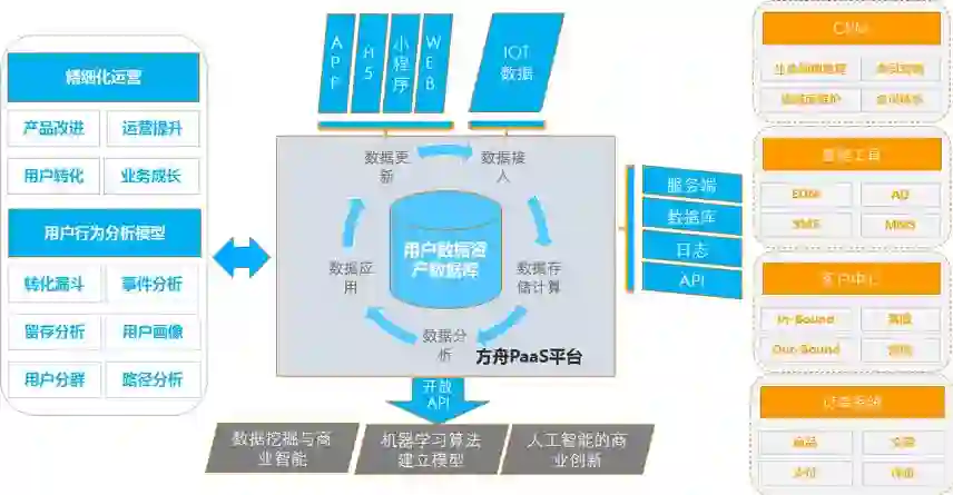 这个模式比较典型的一个实现就是易观方舟,易观方舟以IOTA架构安装到企业内部,帮助企业建立用户行为分析这个CDM的数据河,以“主、谓、宾”的模式打通企业内部用户的各种行为,直接提供给产品和运营做相关的数据分析,同时也是一个PaaS平台,可以供给给其他数据耕种者继续再次加工。