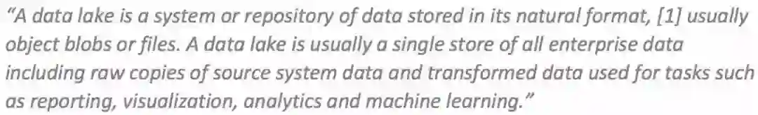 简而言之,数据湖是按存储原始数据格式的数据存储,旨在任何数据可以以最原始的形态储存,可是结构化或者非结构化数据,以确保数据在使用时可以不丢失任何细节,一般以Hadoop系统存储为比较典型的解决方案,所有的实时数据和批量数据,都汇总到数据湖当中,然后从湖中取相关数据用于机器学习或者数据分析。一个典型数据湖的结构如下图所示: