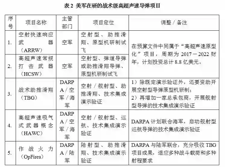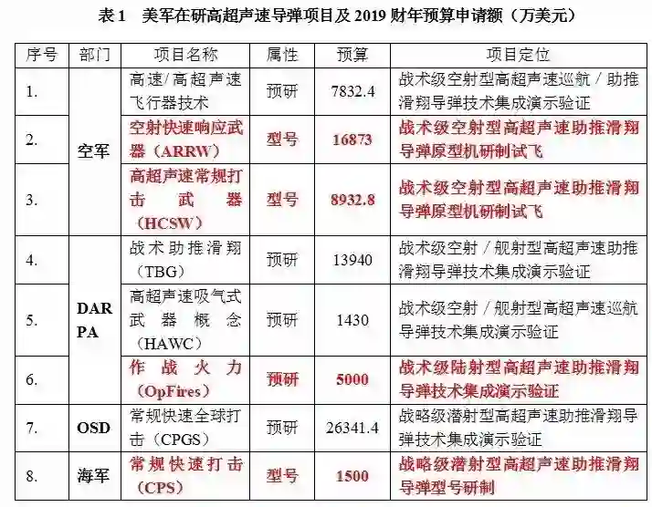 注:1)红色加粗项目为2019财年预算申请文件新增项目。2)表中美空军“高速/高超声速飞行器技术”项目实际用于联合支持DARPA设立的TBG和HAWC两个战术级高超导弹技术集成演示验证项目。3)OSD主管的CPGS项目与海军新设立的CPS项目实际为同一个项目。