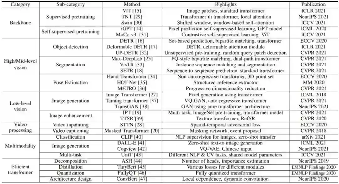 按照视觉 Transformer 的设计和应用场景,本文对视觉 Transformer 模型进行了系统性的归类,如表 1 所示:骨干网络、高 / 中层视觉、底层视觉、多模态等,并且在每一章中针对任务特点进行详细分析和对比;