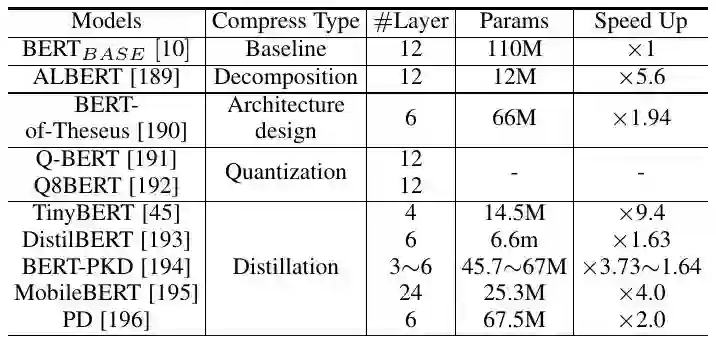 尽管 Transformer 模型在各种任务中取得了成功,但它们对内存和计算资源的高要求阻碍了它们在端侧设备(如手机)上的部署。文章还回顾了为高效部署而对 Transformer 模型进行压缩和加速的研究,这包括网络剪枝、低秩分解、知识蒸馏、网络量化和紧凑结构设计。表 4 列出了一些压缩 Transformer 模型的代表性工作,这些工作采用不同的方法来识别 Transformer 模型中的冗余。具体来说,剪枝侧重于减少 Transformer 模型中组件(例如,层、头)的数量,而分解将原始矩阵表示为多个小矩阵。紧凑模型也可以直接手动(需要足够的专业知识)或自动(例如通过 NAS)设计来得到。