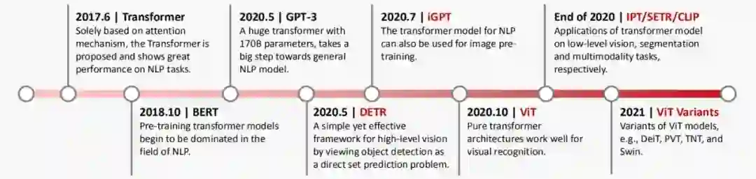 如何将 Transformer 应用于计算机视觉(CV)任务,引起了越来越多研究人员的兴趣。在过去很长一段时间内,CNN 成为视觉任务中的主要模型架构,但如今 Transformer 呈现出巨大的潜力,有望在视觉领域中打败 CNN 的霸主地位。谷歌提出了 ViT 架构,首先将图像切块,然后用纯 Transformer 架构直接应用于图像块序列,就能完成对图像的分类,并在多个图像识别基准数据集上取得了优越的性能。除图像分类任务之外,Transformer 还被用于解决其他视觉问题,包括目标检测(DETR),语义分割(SETR),图像处理(IPT)等等。由于其出色的性能,越来越多的研究人员提出了基于 Transformer 的模型来改进各种视觉任务。为了让大家对视觉 Transformer 在这两年的飞速发展有一个清晰的感受,图 1 展示了视觉 Transformer 的发展里程碑,从图像分类到目标检测,从图片生成到视频理解,视觉 Transformer 展现出了非常强的性能。