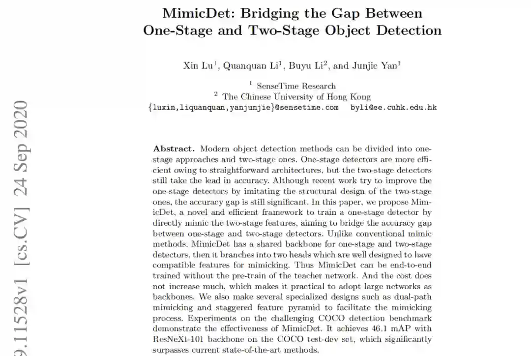 在本文中,我们提出了一个新的训练框架MimicDet,它可以有效地缩小一级和二级检测器之间的精度差距。