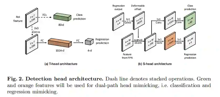 接下来,平化特征将通过两个fc层依次转化为1024-d回归特征和4-d输出。如图2所示,在训练S-head时,以81-d的分类logits和1024-d的回归特征作为模拟目标。标签的分配基于阈值为0.6的IoU标准。分别利用交叉熵损失和L1损失对分类和回归分支进行优化。