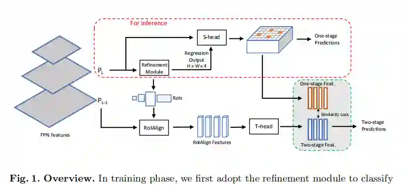 模块和一级检测头S-head组成。在训练阶段,我们增加了一个两阶段的检测头作为Teacher,称为T-Head,来指导S-Head,提高其性能。我们将在接下来的部分详述每一个组成部分。