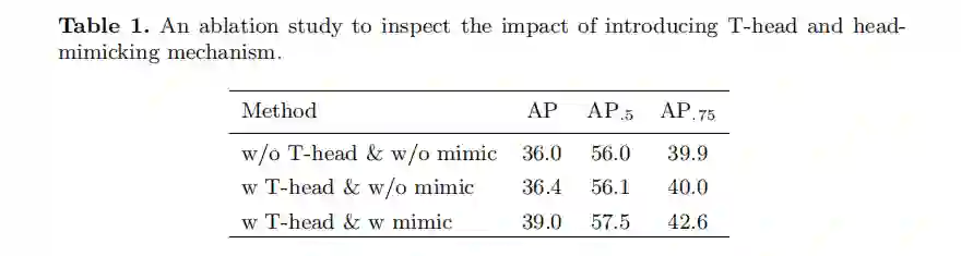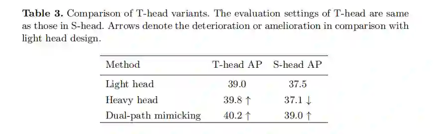 设计分解后的检测头,分别在分类分支和回归分支上进行模拟。分解后的双路径模拟dual-path mimicking使T-head更容易获得有用的信息。