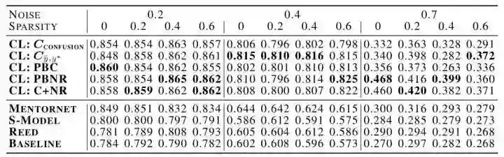 上图给出了CIFAR-10中不同噪声情况和稀疏性情况下,置信学习与其他SOTA方法的比较。例如在40%的噪声率下,置信学习比之前SOTA方法Mentornet的准确率平均提高34%。