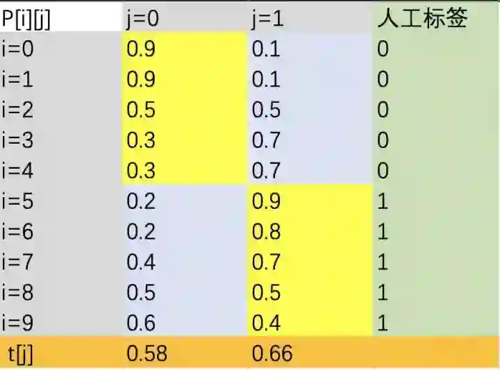 ;为说明问题,这里假设共10个样本、2个类别,每个类别有5个样本。经过计算每个人工标签类别