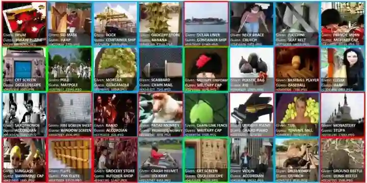 论文还将提出置信学习框架应用于真实世界的ImageNet数据集,利用CL:PBNR找出的TOP32标签问题如图9所示,置信学习除了可以找出标注错误的样本 ( 红色部分 ),也可以发现多标签问题 ( 蓝色部分,图像可以有多个标签 ),以及本体论问题:绿色部分,包括"是" ( 比如:将浴缸标记为桶 ) 或"有" ( 比如:示波器标记为CRT屏幕 ) 两种关系。