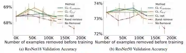 图10给出了分别去除20%,40%…,100%估计错误标注的样本后训练的准确性,最多移除200K个样本。可以看出,当移除小于100K个训练样本时,置信学习框架使得准确率明显提升,并优于随机去除。