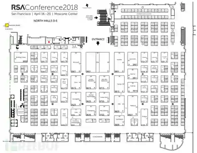 展厅分为南北两厅。北厅是 RSA Security 公司所在地,其展位也相当宽敞,靠近入口,宣示着绝对主权。微软、麦克菲、思科、赛门铁克、IBM、英特尔、Qualys以及瞻博网络等厂商也在北展厅出展。