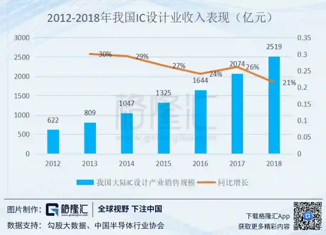 根据全球市场研究机构TrendForce集邦咨询最新“中国半导体产业深度分析报告”指出,2018年中国IC设计产业产值达人民币2,515亿元,年增近23%。以营收排名来看,中国IC设计前三大企业为海思、紫光展锐与北京豪威。接着依次是中兴微电子、华大半导体、汇顶科技、北京硅成、格科微、紫光国微、兆易创新。