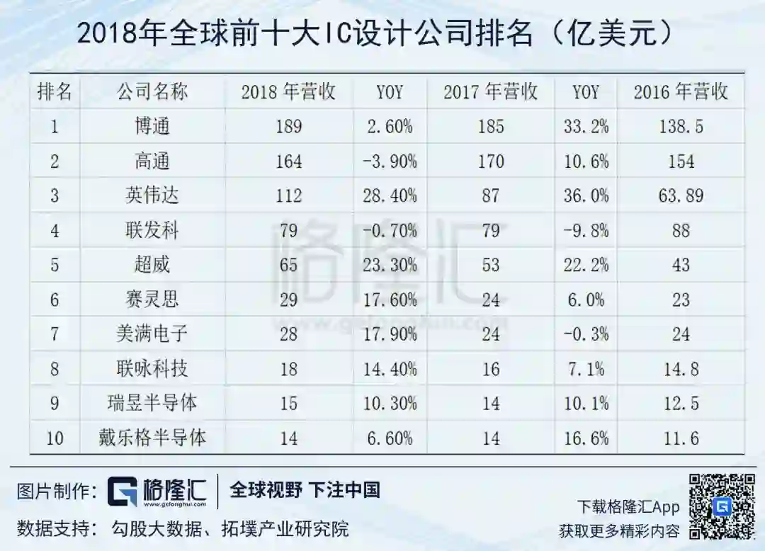 通与博通两家公司的营收就占到前十IC设计公司的50%,可见美国企业从全球半导体行业的发展中获取了更多的好处,另外英伟达、超威(AMD)、赛灵思、美满(marvell)也是美国企业,联发科、联咏科技、瑞昱半导体是台湾企业,戴乐格(Dialog)是德国企业。