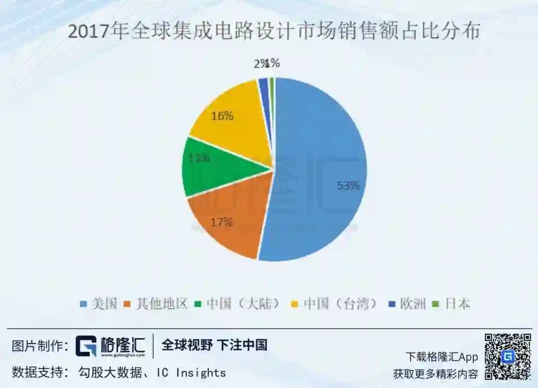目前,全球集成电路设计市场较为集中。从区域分布来看,美国集成电路设计行业仍处于全球领先地位。2017 年美国集成电路设计行业销售额占全球集成电路设计业的 53%,位居全球第一位;中国台湾地区占 16%,位居第二;中国大陆地区的 IC 设计企业,扣除海思半导体、中兴微电子和大唐微电子转移为自用的 IC 产品之外,直接向市场供应的IC产品销售额占11%。
