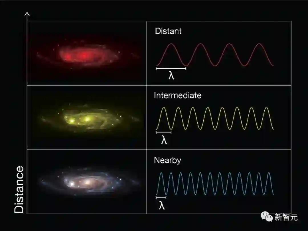 宇宙随着时间不断膨胀。这种膨胀拉伸了光的波长。对我们来说,天体越远,颜色就越红。
