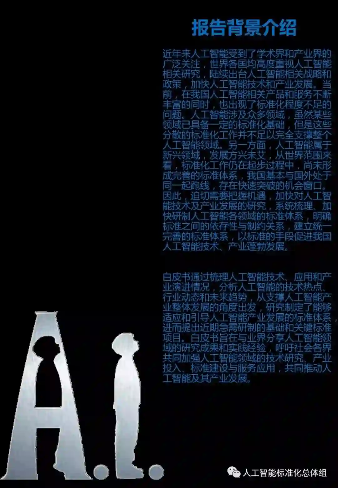 为贯彻落实党的十九大关于推动人工智能和实体经济深度融合工作要求,落实《新一代人工智能发展规划》对标准化工作的部署,充分发挥标准化工作对人工智能技术、产业的支撑推进作用,中国电子技术标准化研究院组织编写了《人工智能标准化白皮书》。