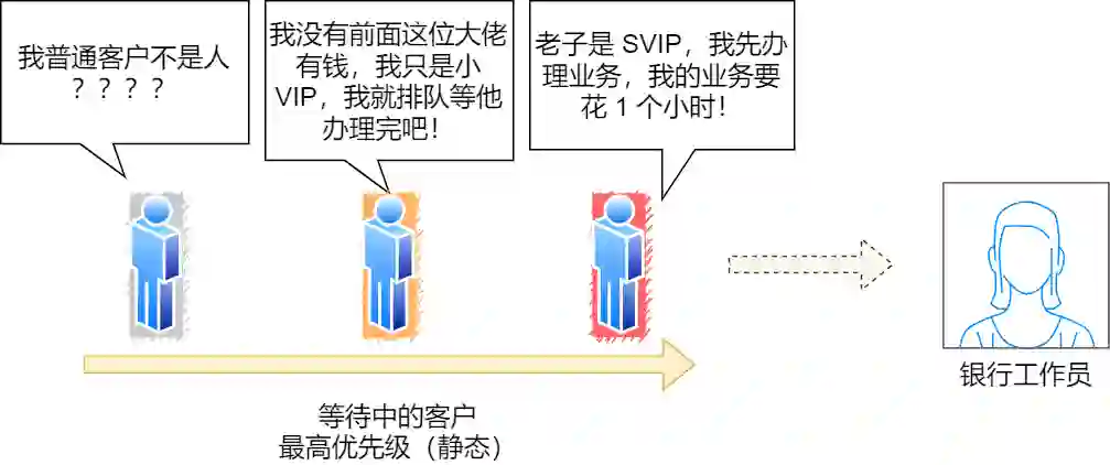 既然公平也可能存在问题,那银行就对客户分等级,分为普通客户、VIP 客户、SVIP 客户。只要高优先级的客户一来,就第一时间处理这个客户,这就是最高优先级(HPF)调度算法。但依然也会有极端的问题,万一当天来的全是高级客户,那普通客户不是没有被服务的机会,不把普通客户当人是吗?那我们把优先级改成动态的,如果客户办理业务时间增加,则降低其优先级,如果客户等待时间增加,则升高其优先级。