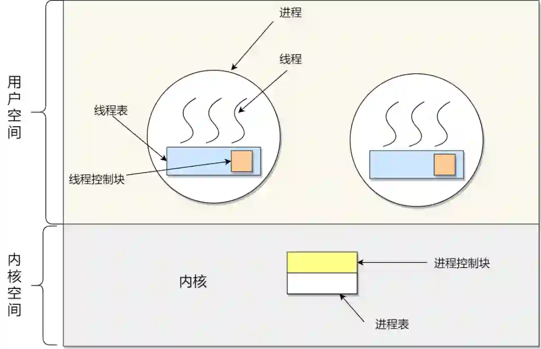 多个用户线程对应一个 LWP 再对应一个内核线程,如上图的进程 2,线程管理是在用户空间完成的,此模式中用户的线程对操作系统不可见。