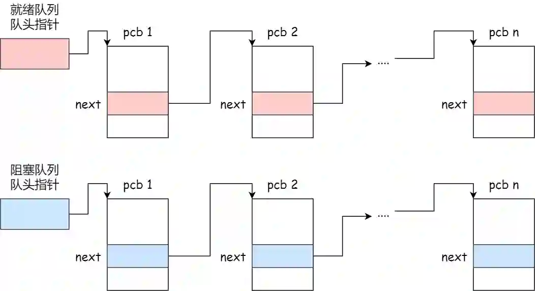 通常是通过链表的方式进行组织,把具有相同状态的进程链在一起,组成各种队列。比如:
