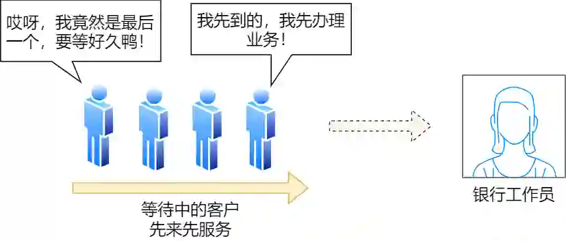 那么最简单的处理方式,就是先来的先处理,后面来的就乖乖排队,这就是先来先服务(FCFS)调度算法。但是万一先来的这位老哥是来贷款的,这一谈就好几个小时,一直占用着窗口,这样后面的人只能干等,或许后面的人只是想简单的取个钱,几分钟就能搞定,却因为前面老哥办长业务而要等几个小时,你说气不气人?