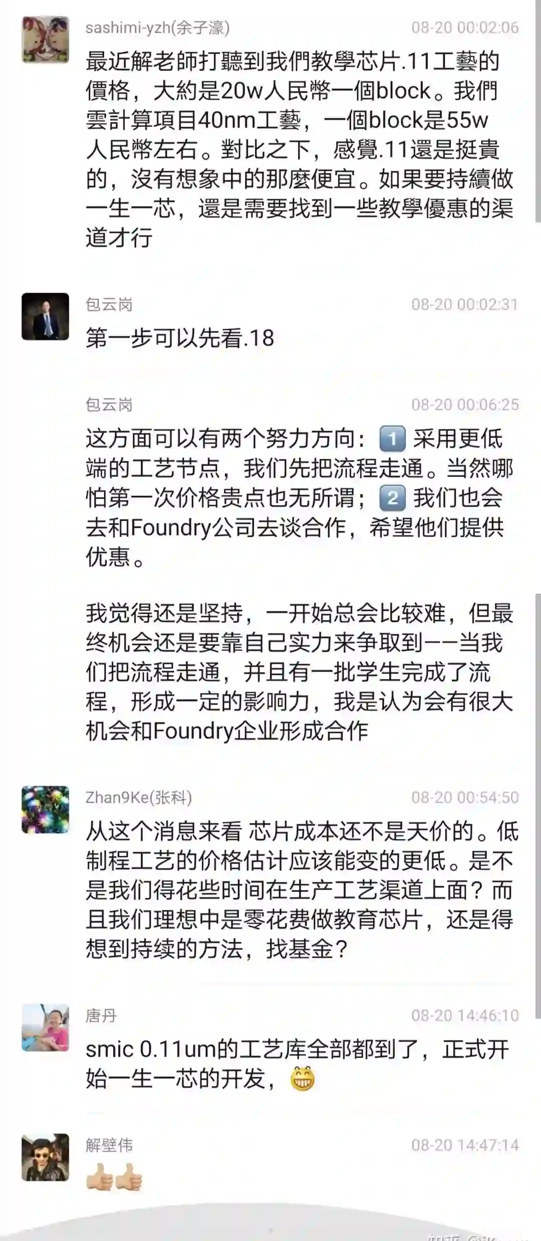 8 月 20 日,当唐丹老师和解壁伟老师终于落实中芯国际 110nm 工艺的流片渠道后,「一生一芯」计划一切准备就绪。