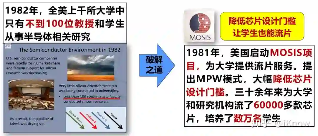 事实上,类似的人才危机美国也曾经历过,1982 年全美上千所大学中只有不到 100 位教授和学生从事半导体相关的研究 。为了应对人才危机,美国国防部高级研究计划署 (DARPA) 在 1981 年启动 MOSIS 项目,为大学提供流片服务,通过 MPW 模式大幅降低芯片设计门槛。30 余年来 MOSIS 为大学和研究机构流了 60000 多款芯片,培养了数万名学生。