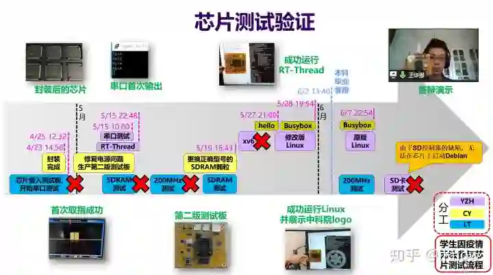 然而疫情还是对测试工作产生了影响,因为学生不能返校,无法到在现场调试与测试。余子濠、蔡晔和刘彤三位挺身而出,协助调试测试工作。测试验证工作其实也是非常具有挑战性,因为从底层 PCB 版图、内存颗粒到中间处理器设计、到上层操作系统、应用软件,每个层次都可能出问题。哪怕一个小问题,都会造成芯片无法正常工作。