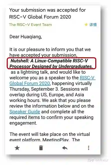 7 月 22 日,王华强又收到了「果壳」被 RISC-V Global Forum 被接收的通知。9 月 3 日,王华强同学将代表团队向全球业界介绍「果壳」的设计,这也是「果壳」首次在国际舞台上亮相。看了一下这次 RISC-V 全球论坛的日程,报告均来自世界各地的业界资深专家,还包括图灵奖得主 David Patterson 教授。国科大本科生能登上 RISC-V 全球论坛介绍他们设计的处理器核,这在国际上也是非常难得了。作为教学团队成员,我们内心也有一份自豪。