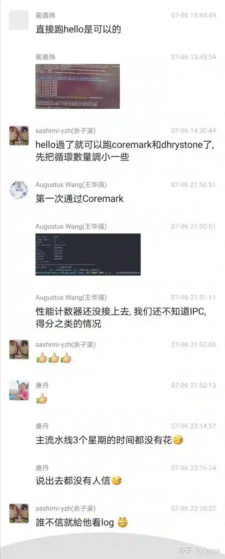 如今,这五位同学正在参与一个更有挑战的项目,开发一款高性能乱序多发射 RISC-V 处理器核的设计。一年前,他们在做「果壳」时还有些吃力,现在已是这个新团队中的骨干,和其他博士生和工程师们一起攻坚克难。去掉团队中蔡晔、唐丹和我这三位 40 岁以上的中年人,这支队伍平均年龄只有 23.1 岁,但他们表现出来的战斗力却是惊人的——不到三个星期就从头开始完成了乱序处理器主流水线的设计与实现,并且通过 CoreMark 测试。等到他们 30 岁时,就可以说已经是处理器芯片和计算机系统设计领域的「老兵」了。那时,他们将进入各自的工作岗位,也许去工业界研发产品,也许在学术界做科研。相信那时他们的创造力会得到更大的发挥和展现。我对这批年轻人的未来充满期待。