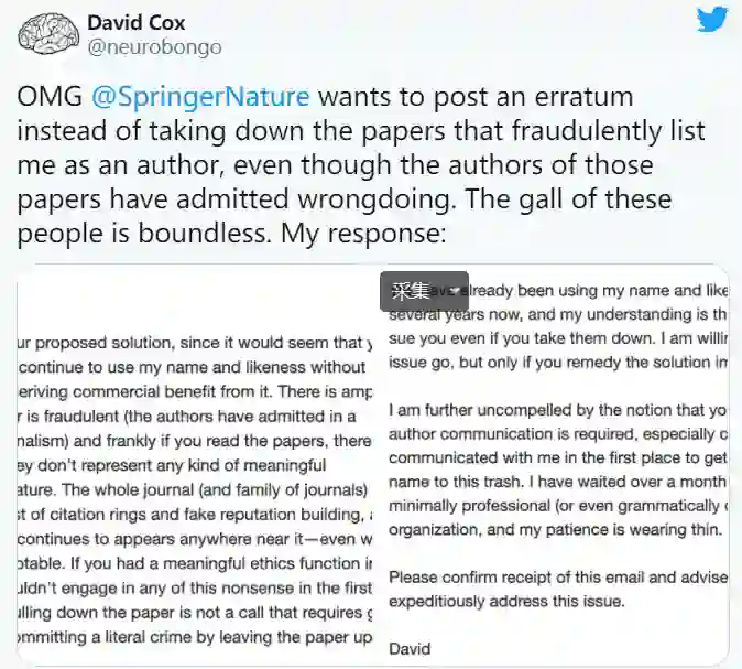 不过,令Cox气愤的是,直到威胁诉诸法律手段之后,对方才同意撤销了与其相关的造假论文。