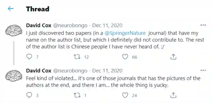 据Cox介绍,他有时常浏览期刊网站的习惯,近日他在DBLP(一个计算机科学领域的论文网站)网站搜索论文时,发现自己赫然出现在了两篇论文的合著者之列,而自己从未参加过该项目,与其他合著者也并不相识。